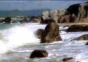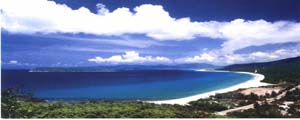 在海南島的最南端,有一處令人神往的游覽勝地, 名字叫做“天涯海角”。 這里南臨碧藍的大海,遠眺浩渺南海,波濤起伏, 海闊天空,征帆片片,白鷗點點。海濱上險石聳立,著名的“天涯”、“海角”和“南天一柱” 等刻石,就在群崖之中,甚為壯觀。