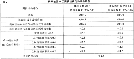 表3、表4、表5給出了嚴(yán)寒地區(qū)和寒冷地區(qū)對(duì)于建筑物的體形系數(shù)和傳熱系數(shù)的極限要求。