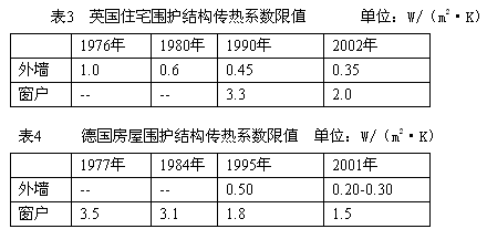 圍護結構傳熱系數限值,英、法、德等國至今已修訂了4次。見(表3、表4):