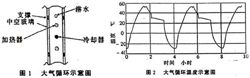 在大氣循環試驗中,將送檢的中空玻璃樣品懸掛在架子上,一面朝向為實驗室環境(見圖1),另一面面臨-32℃~-53℃的溫度,在溫度循環的下降階段,用水澆淋降溫。一個循環為4 個小時(見圖2),整個試驗為320個循環。