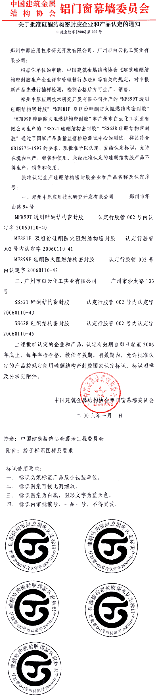 關于批準硅酮結構密封膠企業和產品認定的通知(中建金膠字[2006]第001號)