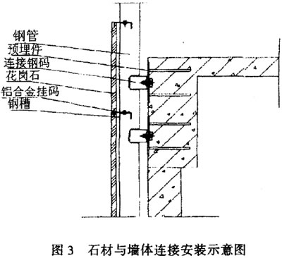 用環氧栩旨注滿槽坑,平穩抬起石板,將槽口對準已固定在橫梁上的扣件緩緩擂人,再將另一對扣件插人上部槽內,使石板稍向前傾,當扣件掛上橫梁后,再讓石板恢復到垂直狀態,并將扣件向下壓實,檢查調整石板的垂直水平進出位置,使其符合立面控制線。如圖3所示。
