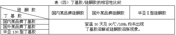 國內某品牌丁基膠、國外某品牌丁基膠及華亞130型丁基膠分別與國內某品牌硅酮膠、國外某品牌硅酮膠及華亞Ⅱ型硅酮中空玻璃密封膠做交叉相容性試驗,硅酮膠厚度均設計為3mm,試件經室溫30天放置及90℃/168h熱處理,分別檢測丁基膠的溶解及硅酮膠的溶脹狀況,試驗結果見表(四)。