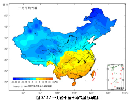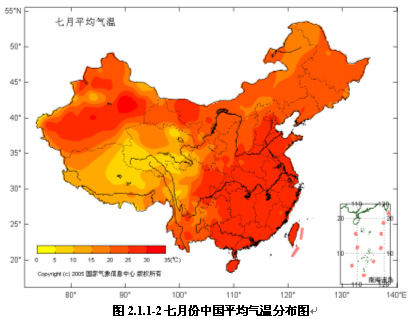 從圖2.1.1-1一月份中國平均氣溫分布圖和圖2.1.1-2七月份中國平均氣溫分布圖中看出,三北地區(qū)一月份大部分都處于0℃以下,更有極端的東北地區(qū)在-35℃以下。七月份三北地區(qū)很大部分也在20℃以下,四川西南部分地區(qū)仍處于5℃左右。因此在這些地區(qū)需要很低隔熱系數(shù)的玻璃,防止室內熱量流失。在中國南方地區(qū)全年大部分時間都處于25℃以上,因此這些地方也很低隔熱系數(shù)的玻璃,防止外部熱量流入室內。因此U值越低越好。
