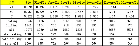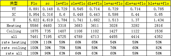 選擇房子模型建筑面積為60m2,墻體面積為180m2,采用高絕熱性材料,窗戶面積86m2占總墻體面積的48%,每個面12%,計算采用NFRC2001標準,冬季室內溫度為21℃,夏季室內溫度為24℃。結果下表