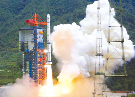 ▲10月24日18時05分,搭載著嫦娥一號的長征三號甲運載火箭在西昌衛星發射中心三號塔架點火發射。