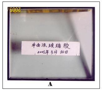2005年3月30日制作的四周邊均施涂3mm厚的玻璃膠與硅酮中空玻璃密封膠直接接觸的中空玻璃,待玻璃膠基本固化后,將中空玻璃立式放置,A面在下,B面在上。中空玻璃室溫放置10天,在受力的A、B面出現明顯的丁基膠溶解且向中空玻璃間隔層內遷移成半橢圓球或不規則的鋸齒狀,而不受力的C、D面丁基膠溶解內遷移現象不明顯。說明玻璃膠內含的礦物油遷移速度受外力影響較大。