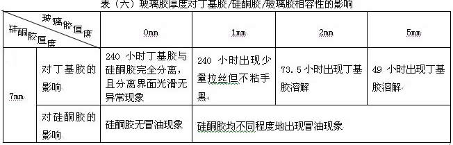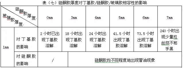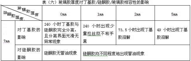 在此丁基膠/硅酮膠/玻璃膠相容性中,丁基膠采用華亞130型丁基中空玻璃密封膠,厚度均為6mm;硅酮膠采用華亞Ⅱ型中空玻璃密封膠,厚度分別設計為0mm、3mm、4mm、5mm、6mm 和7mm;玻璃膠采用市售的含礦物油的玻璃膠,厚度為1mm,試件室溫放置,每間隔適當小時后,從硅酮中空玻璃密封膠邊部慢慢地與丁基膠分離,觀察分離部位丁基膠的溶解情況,指觸有無明顯物質粘黑手上,同時觀察硅酮膠有無異常現象。試驗結果見表(七)。