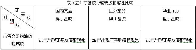 可見,采用含礦物油的玻璃膠與國、內外丁基膠直接相接觸,在極短的時間內(小于2h)均出現了丁基膠溶解現象。