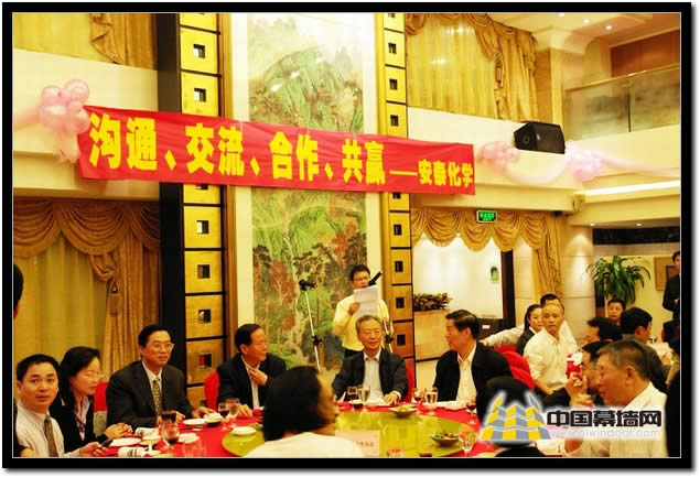 年會期間,廣州安泰化學有限公司舉辦溝通、交流、合作、共贏為主題聯誼晚宴。出席宴會的領導、嘉賓有中國建筑金屬結構協會會長杜宗翰先生、中國建筑金屬結構協會秘書長李建忠先生、中國建筑金屬結構協會副會長徐文鐸先生、鋁門窗幕墻委員會主任黃圻先生、廣東省人大常委會副秘書長金正佳先生、廣州安泰化學有限公司董事長鄒榛夫、廣州安泰化學有限公司市場總監鄒珍凡等。