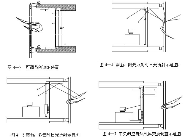 例1:德國Wiesbaden 建筑業(yè)養(yǎng)老基金會的擴建項目,2003年建成。這是一個僅有6層的辦公樓項目,建筑進深12m,窗戶為豎向分三格的落地窗,玻璃采用優(yōu)良隔熱性能的充惰性氣體的三層透明中空玻璃,保證了良好的能見度。這個項目突出的特色之一是安裝在外墻的多功能鋁質(zhì)光線調(diào)整裝置。這個裝置具有包擴采光、遮陽、防眩光、利于自然通風等特點。構(gòu)造示意圖如圖4—3所示,功能如圖4—4到圖4—8。