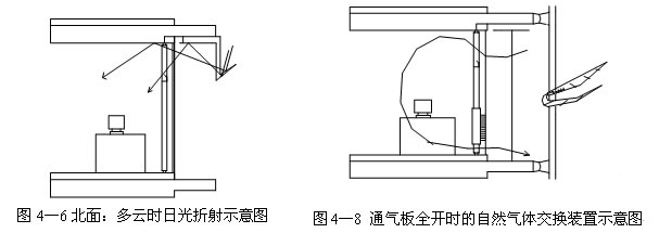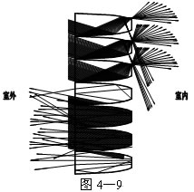 例2:“建筑遮陰用非成像集中器”,其目的在于建筑室內(nèi)對自然采光的最佳利用。其原理是基于復合拋物面狀的集中器在光線輻射方向進行選擇,即光線透射和反射性極強的方向性選擇,來達到對光線能量輸入的合理控制。根據(jù)視角和光線入射角的不同,其結(jié)構(gòu)區(qū)域可呈現(xiàn)透明、半透明、鏡面和漫反射狀反射,這種光學結(jié)構(gòu)的幾何特點,決定了光傳遞和光反射的角度范圍,由于總體的內(nèi)反射效果,強烈的太陽光可被反射掉以避免室內(nèi)高溫,而同時散布的光線則被曲射至室內(nèi)空間,如圖4—9。
