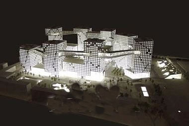 說(shuō)明:“建筑藝術(shù),9棟樓手挽手,可以在空中連廊里游泳”!