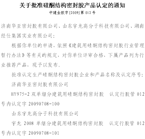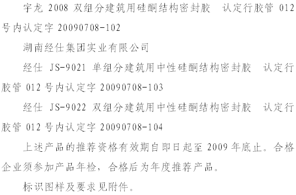 點擊查看>>> 關于批準硅酮結構密封膠產品認定的通知 中建金膠字[2009]第001號 文件點擊查看>>> 關于批準硅酮結構密封膠產品認定的通知 中建金膠字[2009]第006號 文件點擊查看>>> 關于批準硅酮結構密封膠產品認定的通知 中建金膠字[2009]第007號 文件點擊查看>>> 關于批準硅酮結構密封膠產品認定的通知 中建金膠字[2009]第012號 文件點擊查看>>> 關于批準硅酮結構密封膠產品認定的通知 中建金膠字[2009]第014號 文件點擊查看>>> 關于批準硅酮結構密封膠產品認定的通知 中建金膠字[2009]第016號 文件