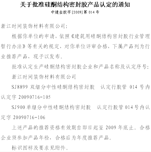 點擊查看>>> 關于批準硅酮結構密封膠產品認定的通知 中建金膠字[2009]第001號 文件點擊查看>>> 關于批準硅酮結構密封膠產品認定的通知 中建金膠字[2009]第006號 文件點擊查看>>> 關于批準硅酮結構密封膠產品認定的通知 中建金膠字[2009]第007號 文件點擊查看>>> 關于批準硅酮結構密封膠產品認定的通知 中建金膠字[2009]第012號 文件點擊查看>>> 關于批準硅酮結構密封膠產品認定的通知 中建金膠字[2009]第014號 文件點擊查看>>> 關于批準硅酮結構密封膠產品認定的通知 中建金膠字[2009]第016號 文件