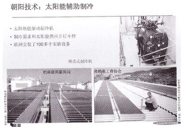 - 適于空氣干燥區 - 通過水蒸發實現制冷效應 2.使用吸收技術通風調節 - 適于空氣過濕區 - 利用有限的制冷效應通風除濕 - 通過太陽能實現除濕流程再生 3.通過吸收式制冷實現太陽能制冷: