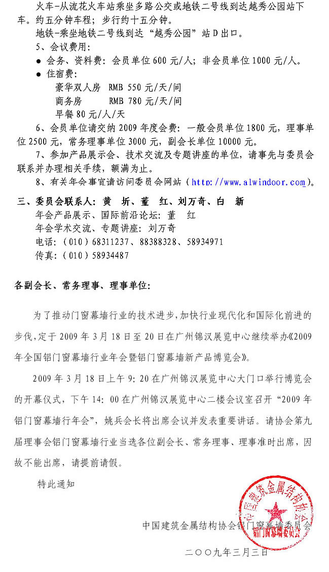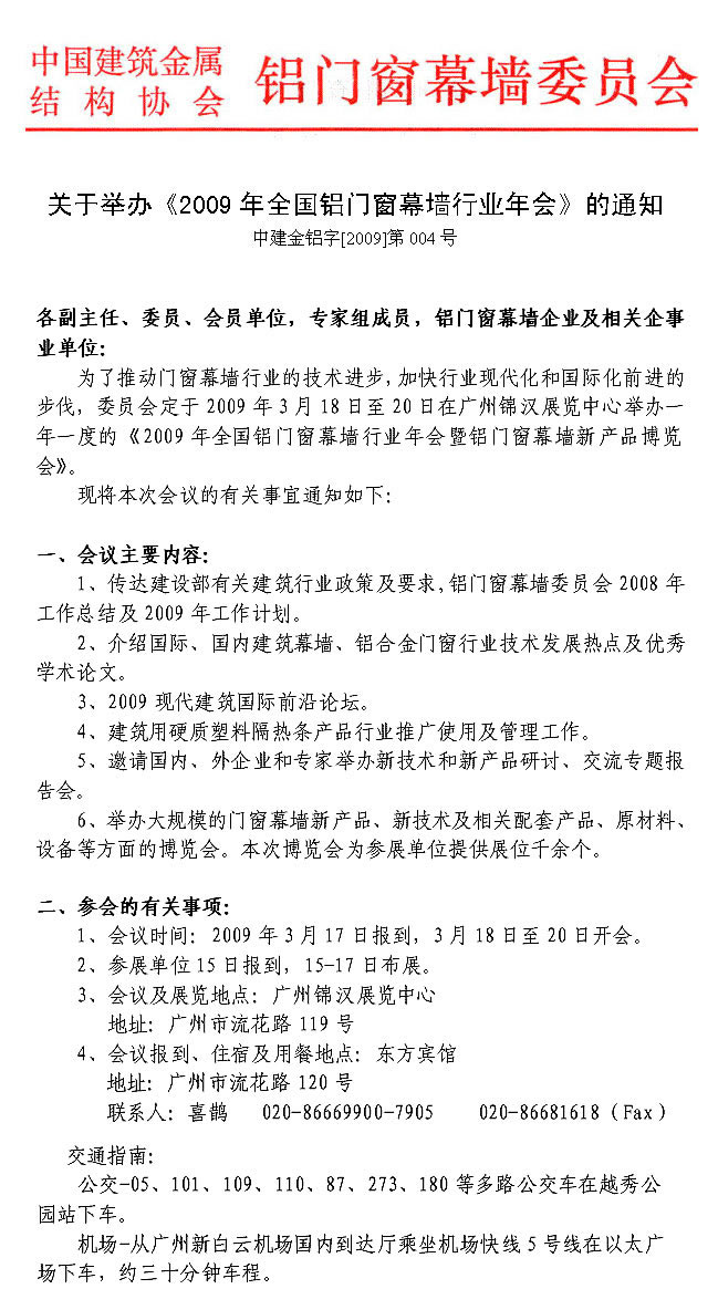 關(guān)于舉辦《2009年全國鋁門窗幕墻行業(yè)年會》的通知