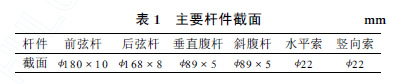 幕墻抗風(fēng)柱采用Q345無縫鋼管。水平與豎向ф22不銹鋼拉索采用1×37規(guī)格單股繩,主要桿件截面見下表1: