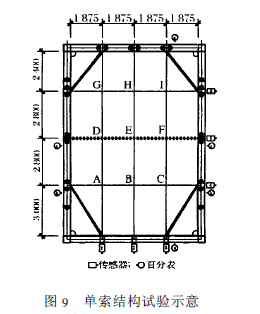 本次試驗選取的平面索網(wǎng)長邊跨度為11200mm,分布3條單索,索間距從左到右依次為3000mm、2800mm、2800mm、2400mm;短邊跨度為7500mm,分布3條單索,索間距均分為1875 mm(如圖9)。主索為1×37股ф22不銹鋼絞線,每股直徑為ф3.15mm。以沙袋重量來模擬水平風(fēng)荷載由玻璃面板通過距形爪點傳遞來的集中力,每個節(jié)點的設(shè)計荷載為:PKA=PKB= PKC=7.20KN;PKD= PKE= PKF=6.93KN;PKG= PKH= PKI=6.44KN。