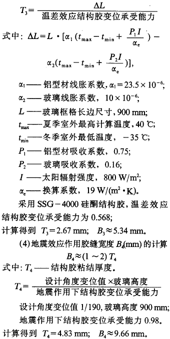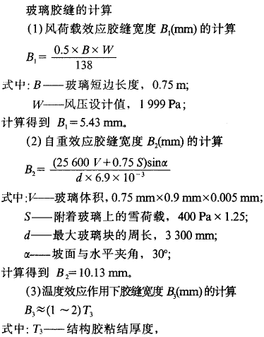 采光頂采用結構性玻璃裝配方法,要進行膠縫設計計算,比較計算出的各種效應所需膠縫的寬度,選用最大值.但膠縫寬度不能小于6 mm,厚度應為膠縫寬度的0.5~1倍,最小也不得小于6 mm,膠縫最大一般不超過12 mm。該采光頂粘接膠縫寬度選擇為12 mm,高度值T選擇為6 mm,滿足要求。計算方法如下: