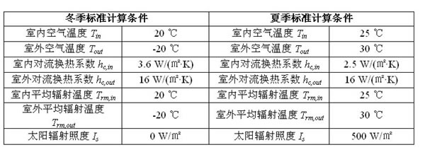 軟件根據《熱工計算規程》要求進行產品設計,采用表1的計算條件條件,門窗邊框的室外對流換熱系數hc,out取8 W/(m2.K),邊框附近玻璃邊緣(65mm內)的室外對流換熱系數hc,out取12 W/(m2.K)。