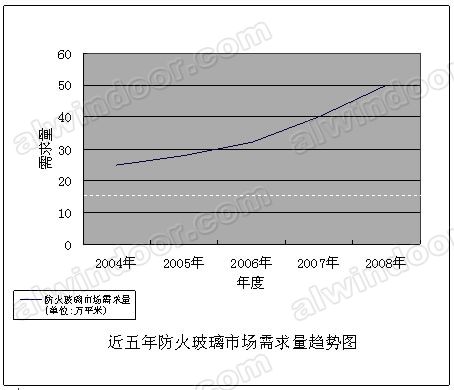 門統(tǒng)計,2004年-2008年我國防火玻璃市場需求分別約為25、28、32、40、50萬平方米,年增速在10-20%以上,增長趨勢加快(見趨勢圖),但遠不如發(fā)達國家普及,發(fā)展空間巨大。業(yè)內(nèi)人士預(yù)測,我國作為全球