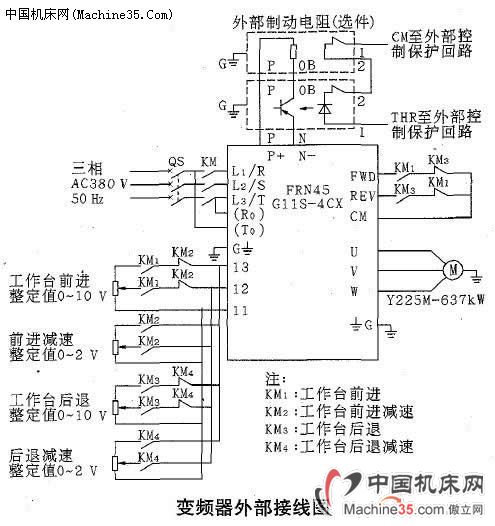 工作臺(tái)主拖動(dòng)系統(tǒng)采用一臺(tái)Y225M一6型、37 kW異步電動(dòng)機(jī),變頻器采用日本富士公司生產(chǎn)的FRN45G11S一4CX變頻器。(考慮到單臂刨機(jī)床工作特點(diǎn),所以選用的變頻器比電動(dòng)機(jī)的規(guī)格大一級(jí)。)因變頻器帶動(dòng)的主電機(jī)在快速換向制動(dòng)時(shí)會(huì)產(chǎn)生很大的反饋能量,所以在改造時(shí)對(duì)刨刀的換向制動(dòng)采用減速制動(dòng)和外部制動(dòng)電阻單元(變頻器的制動(dòng)電阻投入運(yùn)行,可以使這部分能量通過電阻發(fā)熱的方式消耗掉)。以提高變頻器在減速時(shí)的制動(dòng)能力,使制動(dòng)效果更好。