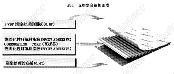 瓦楞復合鋁板的構造一般為三層,外面兩側為0.4-0.8厚的鋁層,中間的瓦楞芯材料采用0,2-0.4,以熱固化性環氧