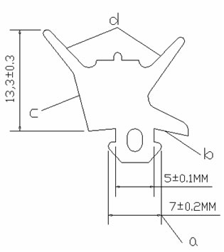 d 處的兩個(gè)向外部張開(kāi)的小邊在安裝后能緊貼玻璃外部,使玻璃與膠條之間的密封效果(水密性,氣密性)更好;