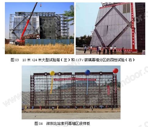 中央電視臺工程項目技術復雜,難度很大,為此專門建造了18米X24米的超大試驗箱,18米高的幕墻菱形區域整體進行多項測試(圖83)。 深圳北站有20000平方米的索網幕墻,設計施工難度較大,為此專門建造了實大樣板,進行設計校核和施工過程的研究(圖84)。