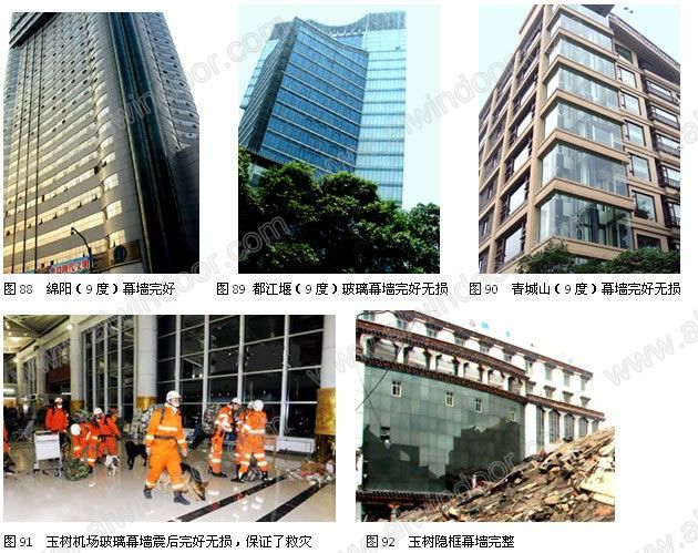 2008年汶川大地震和2010年玉樹大地震的震害調查表明:我國的幕墻規范經受了地震的考驗,按照規范進行設計施工的幕墻工程,達到了設防烈度下保持完好或基本完好的要求,甚至在超烈度的強震下,也還能保持完整(圖88~圖91)。