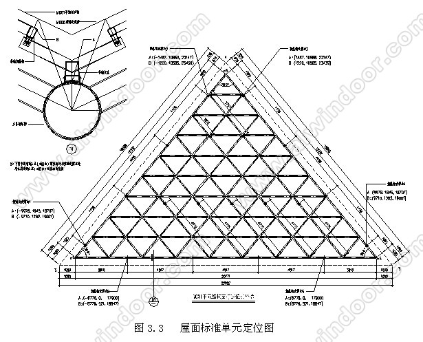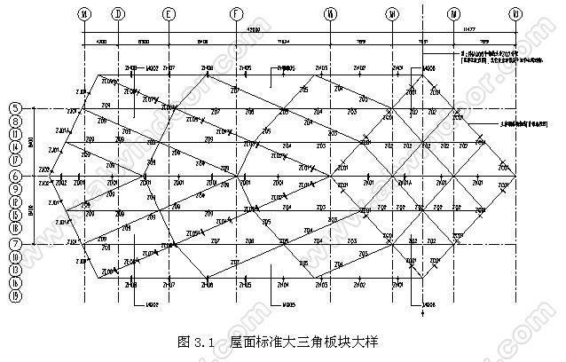 屋面結構體系復雜呈三維空間模型并由幾大單元三角形板塊組成,在