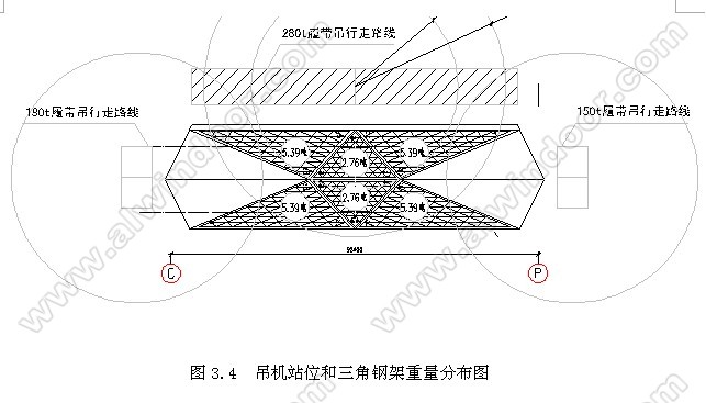 角鋼架。并在現場增加了履帶吊,兩臺西面為180t履帶吊,主要吊裝西面的MQ2三角鋼架,東面為150t履帶吊主要吊裝東面的MQ2三角鋼架。現場支撐鋼結構體系吊裝的技術參數,吊裝三角鋼架的重量統計如下(如圖3.4):