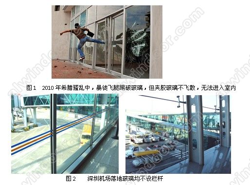 玻璃幕墻采用不可飛散的夾膠玻璃后,消除了室內(nèi)人員穿出室外而墜落的危險(xiǎn),所以可不設(shè)置防撞欄桿(圖2~圖4)。