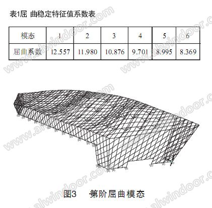 通過線性特征值屈曲分析,可以得到理論上的屈曲穩(wěn)定特征值系數(shù)和屈曲模態(tài)。屈曲穩(wěn)定系數(shù)如下表1,第一階屈曲模態(tài)見圖3,由分析結(jié)構(gòu)表明結(jié)構(gòu)首先出現(xiàn)失穩(wěn)表現(xiàn)為屋面結(jié)構(gòu)彎曲失穩(wěn)。