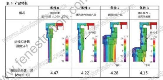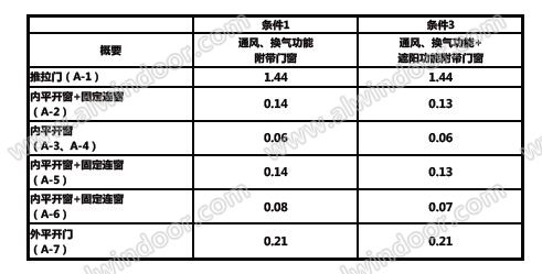 帶有通風·換氣功能的窗(條件1)和條件0作比較,雖然保溫性能低了0.1~0.4 W/(㎡·K),遮陽性能則高了0.01~0.13。這是由于門窗安裝了通風裝置后,保溫性能較好的玻璃的面積變小,而保溫性能較差的鋁框面積則變大的關系。安裝遮陽裝置的門窗(條件2)和條件0作比較,保溫性能提高了0.3~0.7 W/(㎡·K),遮陽性能也提高了0.29~0.37,這是由于包括內藏百葉在內的結構由4層構成,提高了保溫性,并且由于百葉的作用提高了遮陽性能的結果。