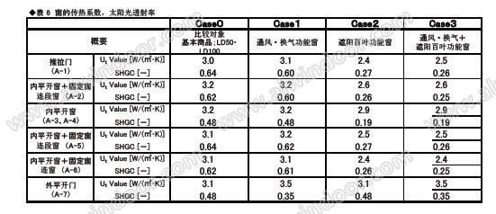 在表6里顯示從條件 0到條件 3的各個門窗(A-1~A-7)的傳熱系數(U值)和太陽光透射比(SHGC)的計算結果。條件O和條件2的U值,所有的窗型都滿足上海的標準值。條件1和條件3的U值,除了外開門以外都能滿足上海的標準值。條件2和條件3的太陽光總透射比,除了外開門以外全部滿足北京最嚴格的標準值。接下來,我們來明確使用從條件0到條件 3的各種門窗的節能性能。