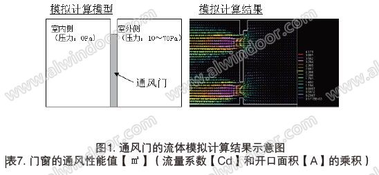 通風時的通風量是根據室內外壓差和門窗的通風性能值(流量系數【Cd】和開口面積【A】的乘積)決定的。通風性能值,是對擁有通風換氣功能的門窗的通風面積,根據它的氣密試驗結果或流體分析結果計算得出的。在門窗打開的情況下,通風性能值考慮單純的開口面積。圖1是通風門的通風面積的流體模擬計算結果示意圖。表7表示門窗的通風特性值。