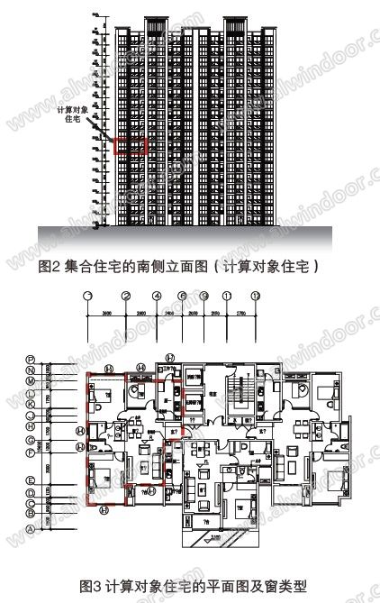圖2表示的是某集合住宅南面的整體立面圖。其中選取了8層東側的戶型作為本次計算對象。住宅的平面圖和窗型開口如圖3中所示,紅色虛線圈起的戶型是本次計算對象,與隔壁戶型或公共樓梯間相間隔的墻體作為本次計算的熱工邊界。