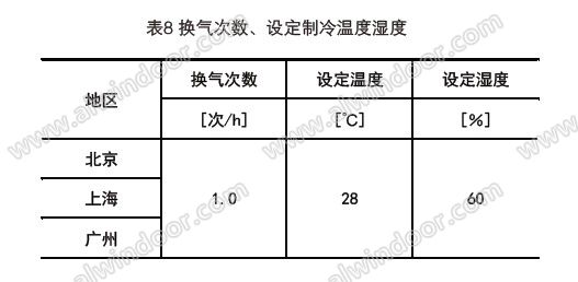 設定外墻全部采用同樣的30mm厚的外墻保溫材料。為了確認各地不同氣象條件的不同影響,換氣次數、制冷的溫度和濕度設定,均采用了一樣的值。設定值如表8表示。制冷時間和在家時間設定,采用了獨立循環型住宅開發計劃中的相關設定。