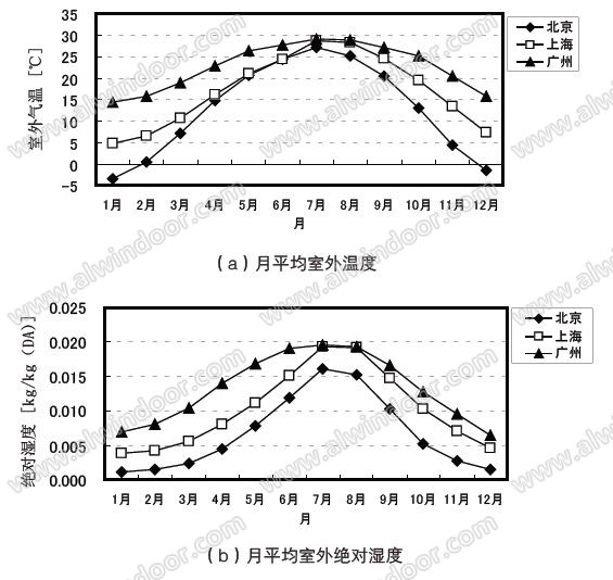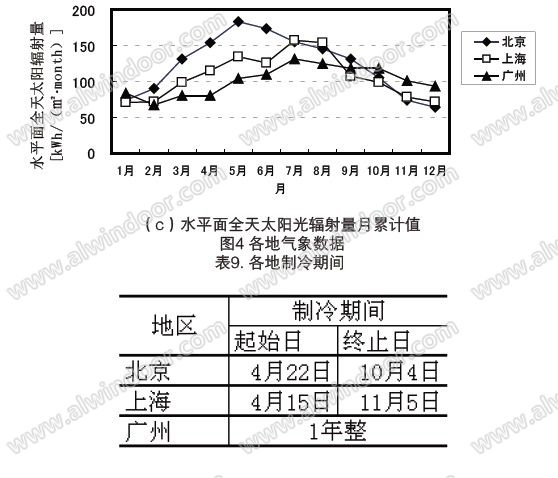 5.2 各地氣象數據 不同氣象條件下,制冷時所需的能耗也不同。圖4表示了,在模擬計算中采用的對制冷有影響的各地室外溫度和室外絕對濕度的月平均值和水平面全天太陽光輻射月累計值等氣象數據。氣象數據采用的是Meteonorm Version 6.0(METEOTEST)里的數據。 使用正弦曲線來模擬室外氣溫,并將該模擬曲線中超過15℃的時間段設定為制冷期間。各地的制冷期間如表9所示,廣州全年需要制冷。
