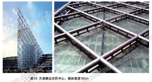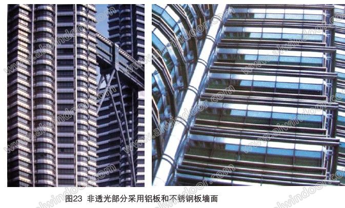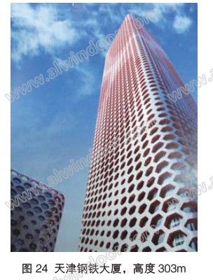 金屬板也是常用的材料之一。吉隆坡石油雙塔高480m,幕墻中造型復雜的非透光部分采用了容易成型的鋁板(詞條“鋁板”由行業大百科提供)和不銹鋼板(詞條“不銹鋼板”由行業大百科提供),銀光閃閃(圖22、圖23)。 天津鋼鐵大廈的鋼板幕墻充分反映了鋼鐵材料的特色,不同規格的六邊形窗孔在墻面上自然形成明暗相間的條紋。幕墻鋼板與外圍主體結構合二為一,整個外墻既是承重,又作圍護(圖24、圖25)。