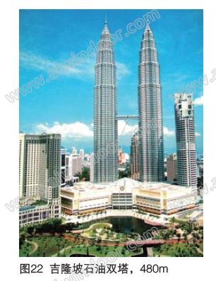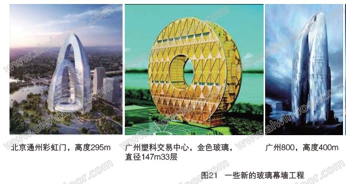 3.各種面板材料的廣泛應用 由于玻璃同時具有透光性(詞條“透光性”由行業大百科提供)、高強度、重量輕、耐久性這四大特點,別的建筑材料無可代替。因此400m 以上超高層建筑幕墻的面板采用玻璃,這種趨勢短期內不會改變,但同時金屬板也得到局部應用,以滿足不同建筑風格和建筑藝術的要求。400m 以下的高層建筑,除大量采用玻璃幕墻外,金屬和石材幕墻也得到較多應用。 玻璃幕墻的一些新工程見圖21。
