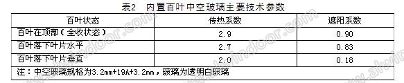 為了保證整窗達到遮陽系數SC≤0.2、傳熱系數K≤2.5W/(m2K)的研發目標,根據《建筑門窗玻璃幕墻熱工計算規程》(JGJ/T 151-2008)中統一的邊界條件,采用廣東省建筑科學研究院開發的粵建科MQMC軟件及美國LBNL實驗室開的WINDOW6軟件,對窗的遮陽及隔熱進行計算和設計,并選用了內置百葉中空玻璃和隔熱鋁型材等作為遮陽隔熱的材料。內置百葉中空玻璃是一種新型的遮陽產品,可通過手動或電動方式調節內置百葉的不同啟閉狀態,可容易取得窗的不同傳熱系數和遮陽效果,能根據不同季節的室外條件來營造更加舒適的室內光線和居住條件,使得窗具有更好的適用性。而且,在南方沿海臺風暴雨氣候條件下,遮陽百葉密封于中空玻璃內,不會受到風吹雨打而損壞,較外遮陽構件耐久性強,使用安全性好,能實現外窗本身遮陽一體化系統。內置百葉中空玻璃的傳熱系數和遮陽系數見表2。