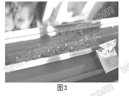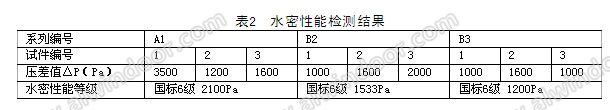 超高水密性能是階梯形雙腔三道密封外平開鋁合金窗系統結構設計的重要部分,也是最具有創新性的設計。通過實驗室嚴格的波動加壓試驗驗證表明,窗外側雨水在風力作用下,在中間密封膠條和內側等壓腔的作用下,雨水進入不到內側空腔,僅在內側空腔的進氣孔處可觀察到微量的水蒸氣附于鋁型材壁上。圖3為經過1000Pa±500 Pa波動加壓水密試驗后的窗框雨水分布情況,在窗框內側空腔處不見有任何滲漏的水跡。表2為A1、B2、B3系統在波動加壓(⊿P±50%)作用下的水密性能檢測結果,其水密性能遠高于研發的目標值。