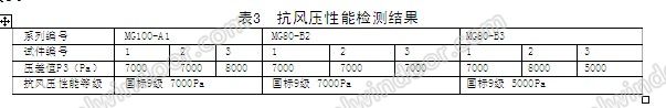 為了適應夏熱冬暖地區,特別是沿海地區高風壓的自然氣候條件,階梯形雙腔三道密封外平開鋁合金窗系統在結構設計上充分考慮了抗風壓的基本性能要求。在研發過程中,根據相關規范的要求進行了抗風壓結構計算和設計,圖4為A1系列窗抗風壓性能的結構計算結果。通過實驗室檢測驗證,階梯形雙腔三道密封外平開鋁合金窗系統A1、B2、B3、系列產品的抗風壓性能均達到或超過國家標GB/T7106-2008規定的最高等級9級,具體檢測結果見表3。