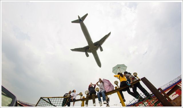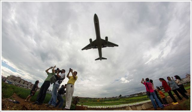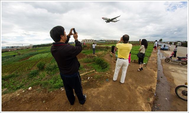 昆明市民在巫家壩國際機場外觀看飛機降落