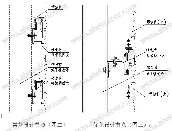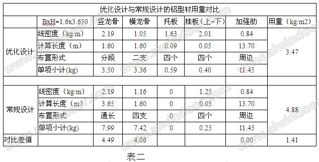 影響幕墻成本的因素很多,諸如結(jié)構(gòu)形式,材料選擇,費(fèi)率等。在面材及費(fèi)率已定情況下,結(jié)構(gòu)形式便成為影響造價(jià)的主要因素。表二為優(yōu)化設(shè)計(jì)與常規(guī)設(shè)計(jì)的型材用量對(duì)比。以人大科教中心工程為例,計(jì)算單元取一個(gè)層間(參考圖七-分格圖),對(duì)二者進(jìn)行對(duì)比分析。其中豎龍骨采用80x60xδ3 (也可用T型龍骨)背部加強(qiáng)肋均選用δ3槽鋁(見圖六),常規(guī)節(jié)點(diǎn)設(shè)計(jì)未表示背部加強(qiáng)肋(見圖二)板容易翹曲,因此成本計(jì)算時(shí)按有加強(qiáng)肋考慮。(見表二)