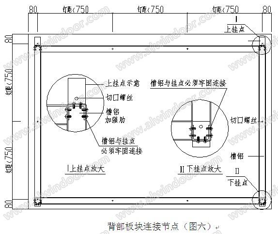 五金件在板的背面將金屬掛件作不可見的固定,板材被固定在龍骨系統(tǒng)上。千思板的分格一般較大,僅靠四個(gè)掛點(diǎn)的切口螺釘受力是不安全的,因此板背面必須有加強(qiáng)肋,(見圖六)隔一定間距布后置切口螺釘,詳見表一。