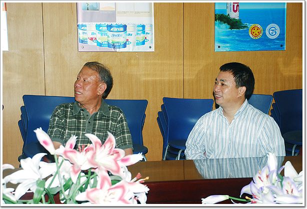 ▲李秉仁會長(左)和集泰化工董事長鄒榛夫一起聽取匯報